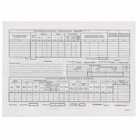 Бумага офсетная плотностью 60 г/м2. Внутренний блок проклеен по одному краю. В путевом листе содержатся графы, которые соответствуют требованиям учета времени въезда и выезда, расхода топлива и другие данные. Формат А4 (198х275 мм). Поставляется в виде книжки в количестве 100 штук в термоусадочной пленке. Соответствует государственным стандартам документального ведения учета.