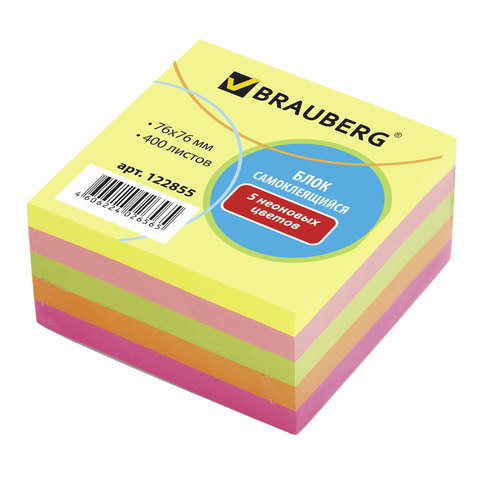 Блок самоклеящийся (стикер), BRAUBERG, НЕОНОВЫЙ, 76х76 мм, 400 л., 5 цветов, 122855