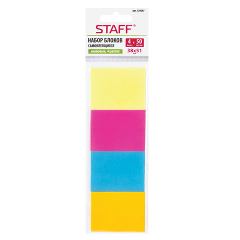 Блоки самоклеящиеся (стикеры) STAFF, НЕОНОВЫЕ, НАБОР 4 шт., 38х51 мм, 50 листов, цвет ассорти, 129347