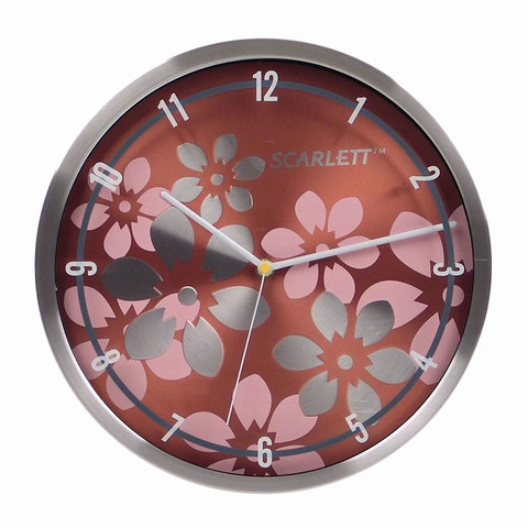 Часы настенные SCARLETT SC-33B, круг, коричневые с цветочным рисунком, серебристая рамка, 30x30x5,2 см, SC - 33B