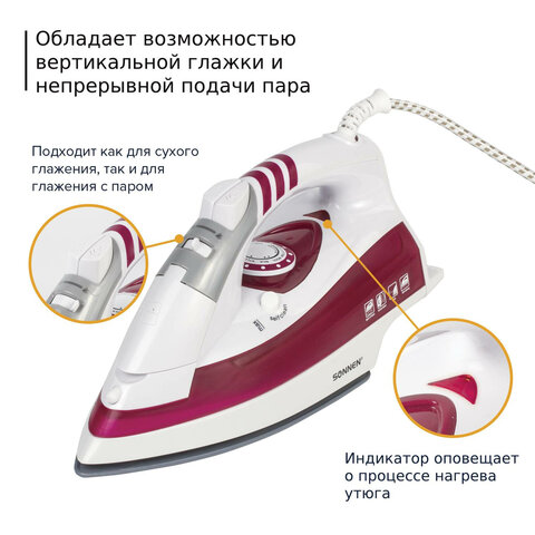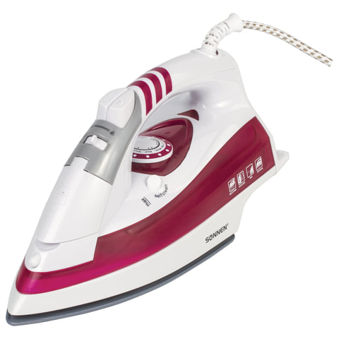 Утюг SONNEN SI-218, 2200 Вт, керамическое покрытие, паровой удар, бордовый/белый, 453506