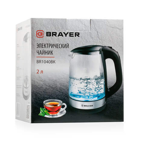 Чайник BRAYER BR1040BK, 2 л, 2200 Вт, закрытый нагревательный элемент, стекло, черный