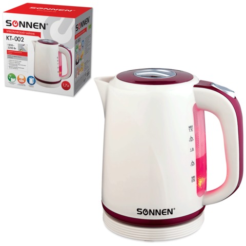 Чайник SONNEN KT-002, закрытый нагревательный элемент, объем 1,7 л, 2200 Вт, пластик, бежевый/красный, 451711