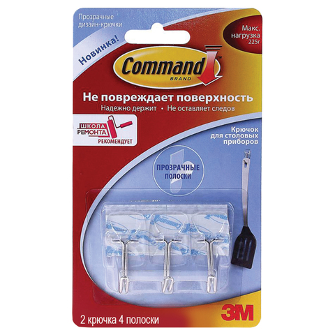Крючки самоклеящиеся COMMAND, комплект 3 шт., для столовых приборов, легкоудаляемые, прозрачные, до 225 г, 17067CLR RU