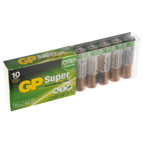 Батарейки GP Super, AA (LR6,15А), алкалиновые, пальчиковые, КОМПЛЕКТ 10 шт., в пленке, 15A-2CRB10, GP 15A-2CRB10