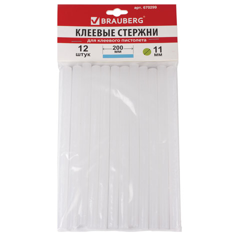 Клеевые стержни, диаметр 11 мм, длина 200 мм, белые, комплект 12 штук, BRAUBERG, европодвес, 670299