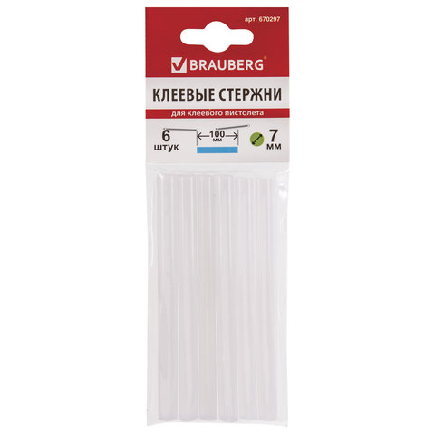 Клеевые стержни, диаметр 7 мм, длина 100 мм, белые, комплект 6 штук, BRAUBERG, европодвес, 670297