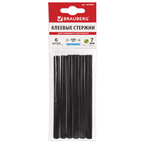 Клеевые стержни, диаметр 7 мм, длина 100 мм, черные, комплект 6 штук, BRAUBERG, европодвес, 670307