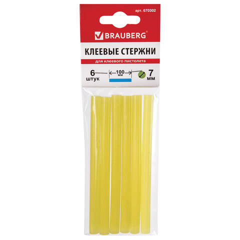Клеевые стержни, диаметр 7 мм, длина 100 мм, желтые, комплект 6 шт., BRAUBERG, европодвес, 670302