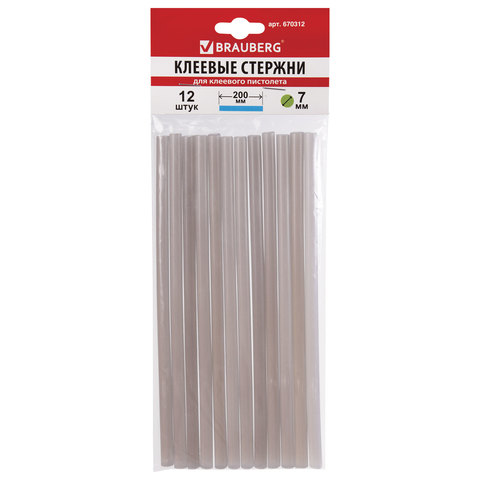 Клеевые стержни, диаметр 7 мм, длина 200 мм, серебристые, комплект 12 шт., BRAUBERG, европодвес, 670312