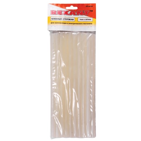 Клеевые стержни, диаметр 7 мм, прозрачные, REXANT, комплект 10 шт., длина 197 мм, в упаковке с европодвесом, 09-1003