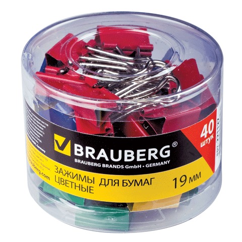Зажимы для бумаг BRAUBERG, комплект 40 шт., 19 мм, на 60 л., цветные, в пластиковом цилиндре, 221127
