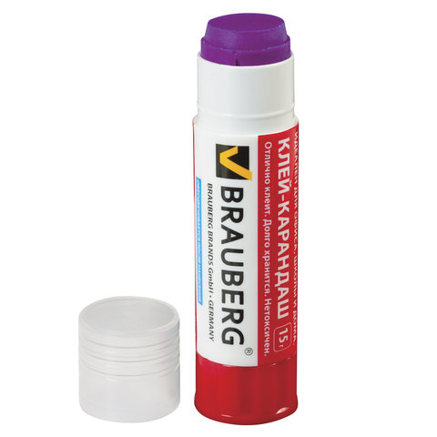 Клей-карандаш BRAUBERG с клеящим полимерным компонентом подкрашен пигментом, который обесцвечивается при контакте с воздухом. Слой клея на бумаге хорошо виден, что помогает наносить клей предельно точно и аккуратно.