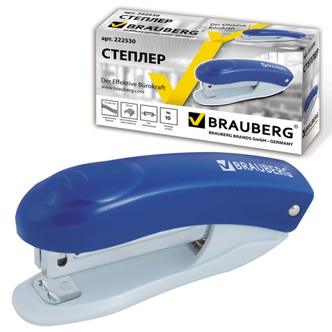 Степлер BRAUBERG "Einkommen", №10, до 12 листов, металлический механизм, встроенный антистеплер, синий, 222530