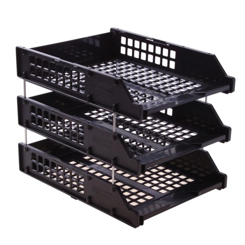 Лотки надёжно стыкуются друг с другом металлическими стержнями (6 см). Верхний лоток разворачивается на 90 градусов - это удобно для документооборота между 2-мя сотрудниками. Функциональная и легкая конструкция, устойчивая за счёт резиновых ножек.