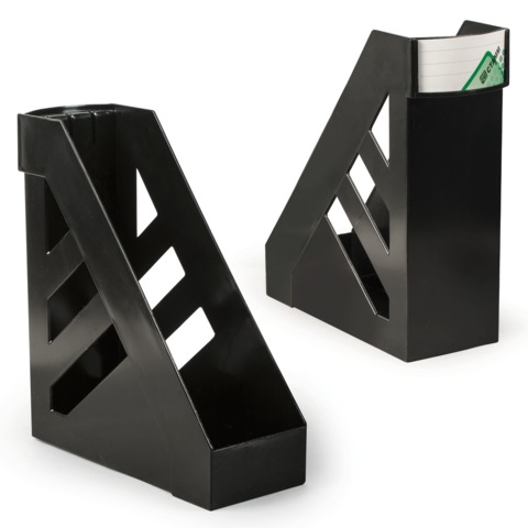 Вертикальный вместительный лоток для бумаг в классическом дизайне из высококачественного прочного пластика с гладкой глянцевой поверхностью. Фирменные сменные таблички для маркировки. Устойчивый, подходит для хранения тяжёлых папок и каталогов.