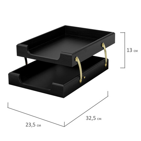 Все предметы изготовлены из дерева черного цвета с золотистой фурнитурой. Набор упакован в подарочную коробку, а также дополнительно в защитный гофрокорб для транспортировки.