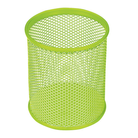 Яркая металлическая подставка-органайзер с круглым основанием предназначена для хранения различных канцелярских принадлежностей.