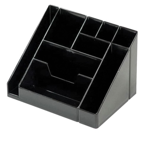 Органайзер отличается удачным сочетанием вместительности и компактности размеров. 9 отделений для канцелярских принадлежностей, визиток и листков для записей. Прочный корпус, гладкая глянцевая поверхность.