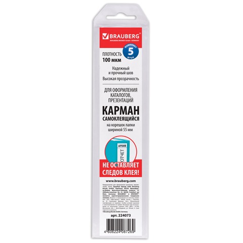 Карманы самоклеящиеся BRAUBERG, комплект 5 шт., 191х35 мм, на корешок папки 50 мм, 224073
