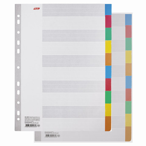 Набор картонных разделителей листов формата А4. Универсальная перфорация подходит для всех видов папок и имеет 11 отверстий. Выступающие цветные табуляторы дополнительно укреплены УФ-лаком.