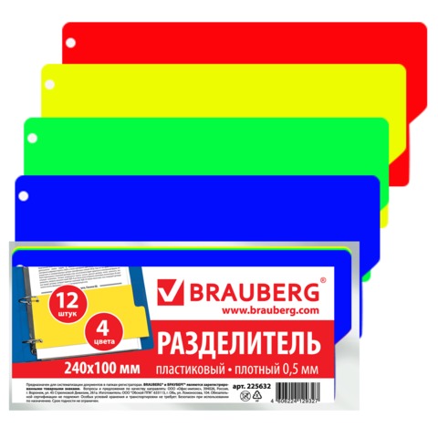 Разделитель пластиковый BRAUBERG, 105х240 мм, 12 листов, без индексации, цветной, Россия, 225632