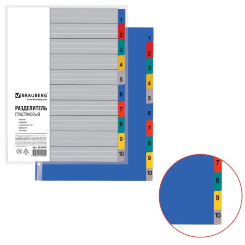 Разделитель пластиковый BRAUBERG, А4, 10 листов, цифровой 1-10, оглавление, цветной, Россия, 225609