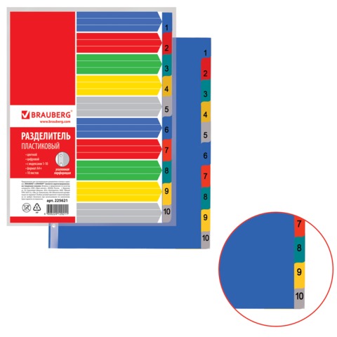 Разделитель пластиковый BRAUBERG, А4+, 10 листов, цифровой 1-10, оглавление, цветной, Россия, 225621