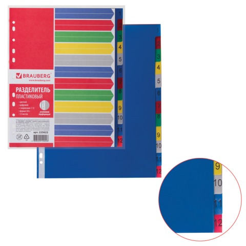Разделитель пластиковый BRAUBERG, А4+, 12 листов, цифровой 1-12, оглавление, цветной, Россия, 225622