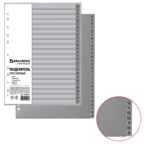 Разделитель пластиковый BRAUBERG, А4, 20 листов, алфавитный А-Я, оглавление, серый, Россия, 225601