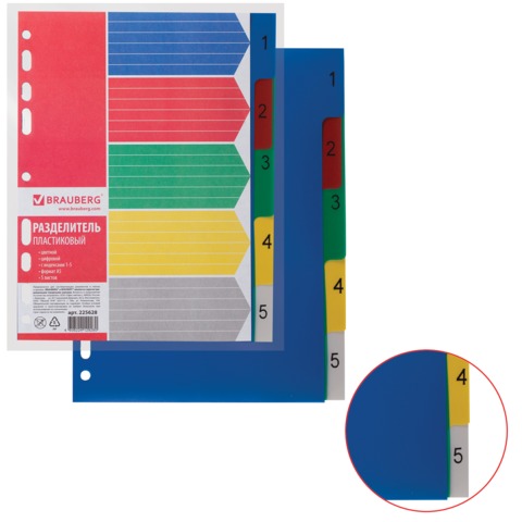 Разделитель пластиковый BRAUBERG, А5, 5 листов, цифровой 1-5, оглавление, цветной, Россия, 225628