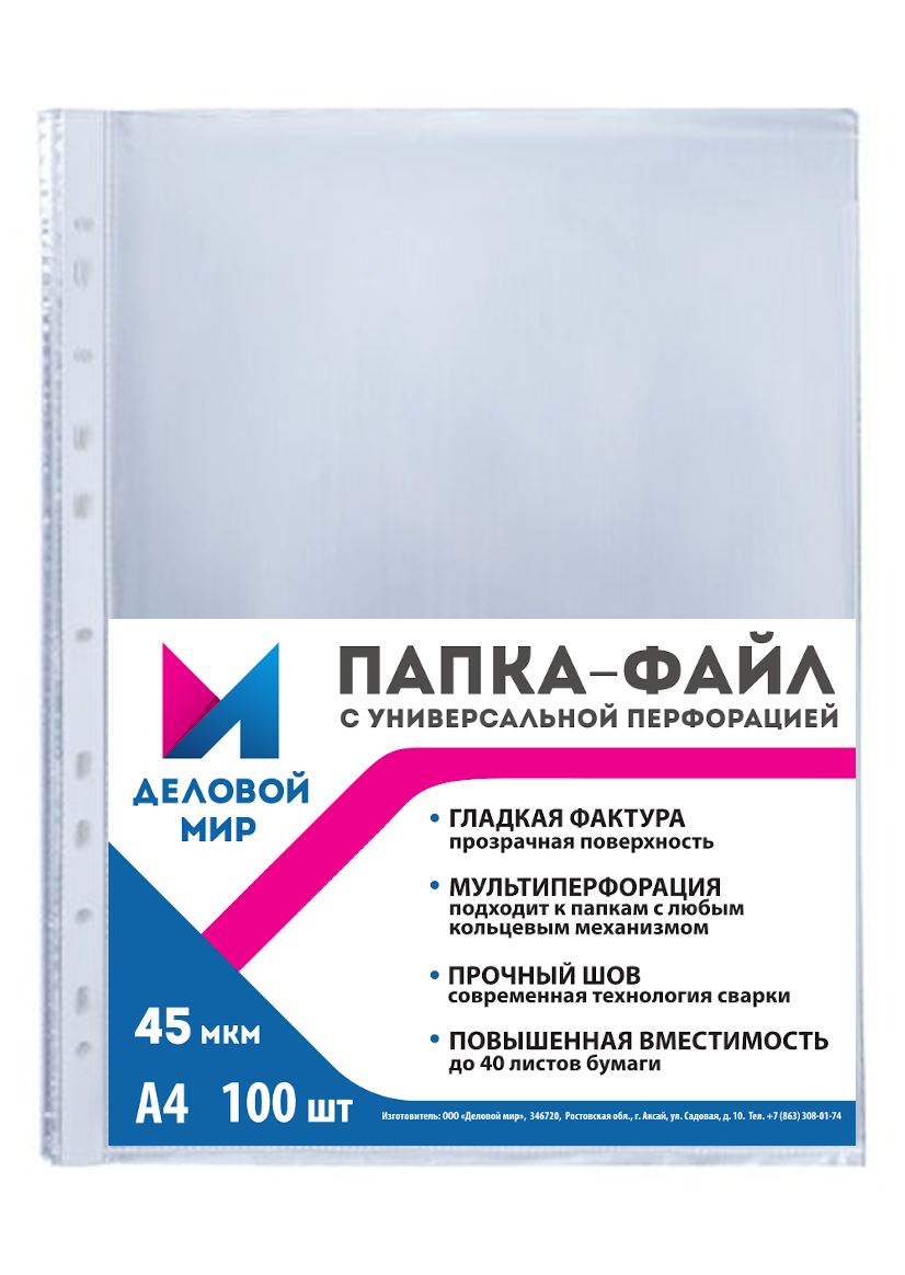 Папки-файлы перфорированные ДЕЛОВОЙ МИР комплект 100 шт., гладкие, 45 мкм, А4