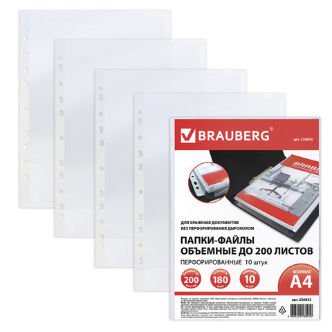 Папки-файлы перфорированные, объемные, до 200 листов, A4, комплект 10 шт., 0,18 мм, BRAUBERG, 226833
