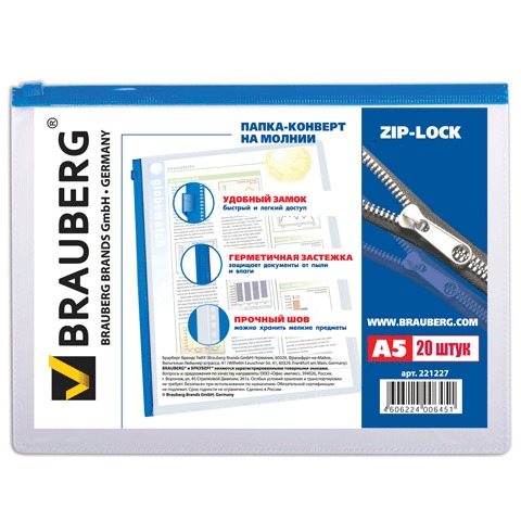 Папка-конверт на молнии МАЛОГО ФОРМАТА (245х190 мм), A5, прозрачная, молния синяя, 0,11 мм, BRAUBERG, 221227