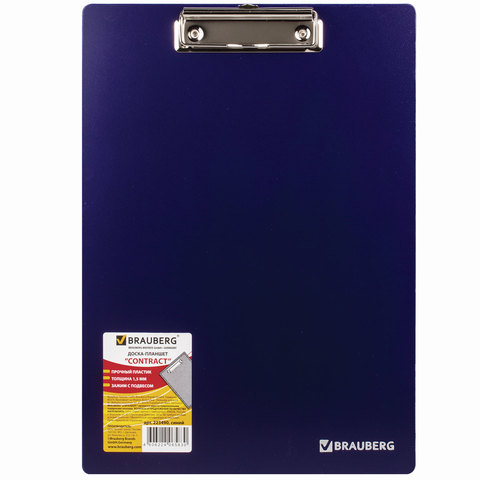 Доска-планшет BRAUBERG "Contract", плотная, с верхним зажимом, А4, 313х225 мм, пластик, синяя, 1,5 мм, 223490