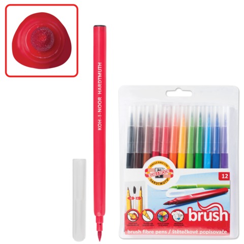 Фломастеры KOH-I-NOOR, 12 цветов, наконечник-кисть, смываемые, трехгранные, пластиковая упаковка, 771009AB01TE