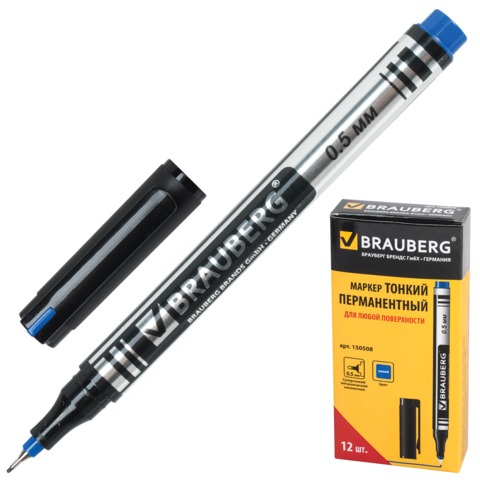 Маркер перманентный (нестираемый) BRAUBERG "Jet", супертонкий металлический наконечник 0,5 мм, синий, 150508