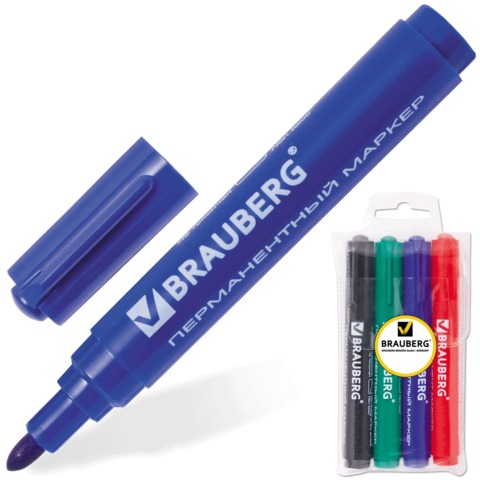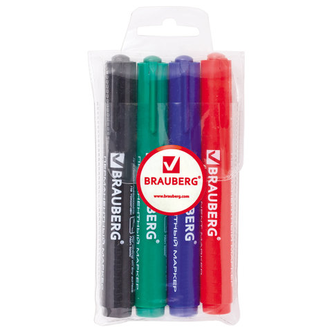 Маркеры перманентные (нестираемые) BRAUBERG "Classic", набор 4 шт., (черный, синий, красный, зеленый), 150299