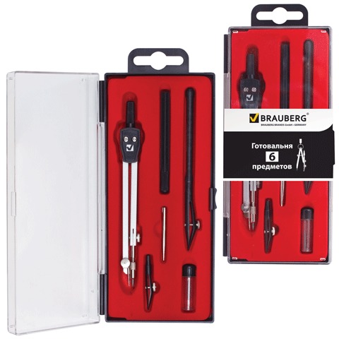 Готовальня BRAUBERG "Architect", 6 предметов: циркуль, рейсфедер+вставка+держатель, игольная вставка, грифель, 210342