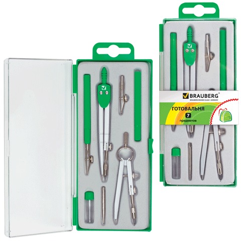 Готовальня BRAUBERG "Klasse", 7 предметов: циркуль+кронциркуль, рейсфедер+держатель, 2 вставки, грифель, 210344