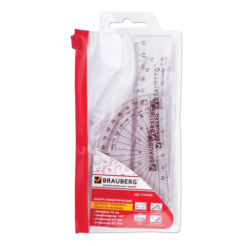 Набор чертежный малый BRAUBERG (линейка 15 см, 2 угольника, транспортир), конверт на молнии, 210306