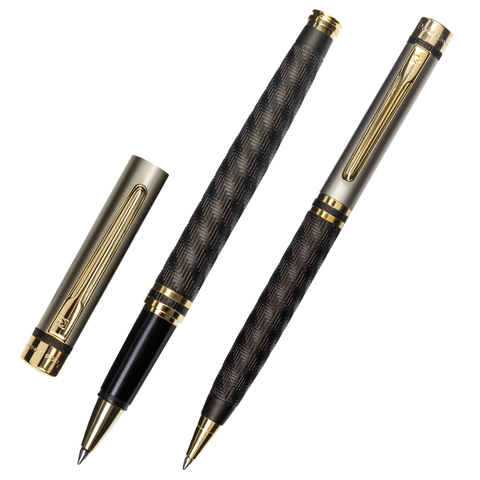 Набор ручек PEN and PEN, состоит из шариковой ручки и роллера. Корпуса ручек изготовлены из латуни с матовым рельефным покрытием. Позолоченный клип украшен фирменным логотипом. Ручки снабжены поворотным механизмом. Упакованы в подарочную коробку.