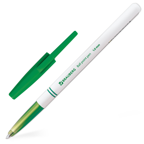 Ручка шариковая BRAUBERG "Офисная", корпус белый, узел 1 мм, линия письма 0,5 мм, зеленая, 141511