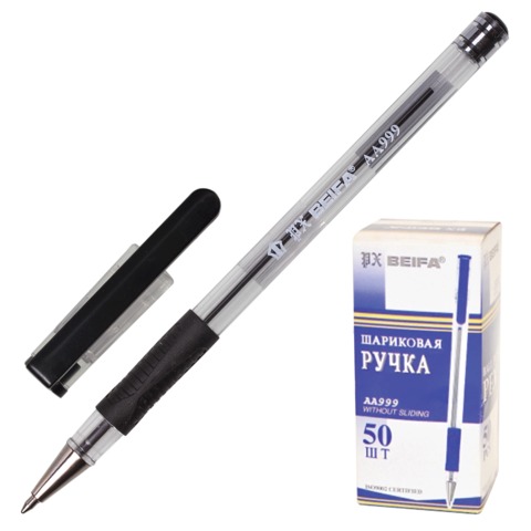 Ручка шариковая BEIFA (Бэйфа), корпус прозрачный, узел 0,7 мм, линия 0,5 мм, резиновый упор, черная, AA999-BK