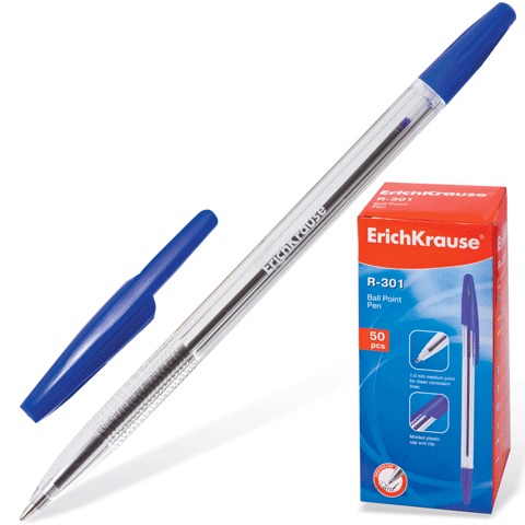 Ручка шариковая ERICH KRAUSE "R-301", корпус прозрачный, узел 1 мм, линия 0,5 мм, синяя, 43184