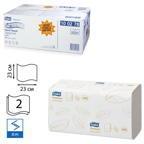Полотенца бумажные 200 шт., TORK (Система H3) Premium, комплект 15 шт., 2-слойные, белые, 23х23, ZZ(V), 100278