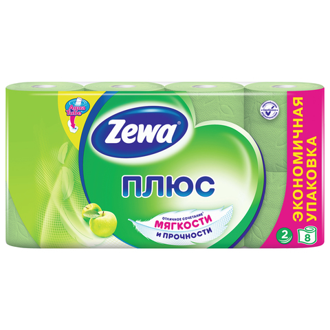 Бумага туалетная бытовая, спайка 8 шт., 2-х слойная (8х23 м), ZEWA Plus, аромат яблока, 144006