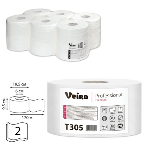 Бумага туалетная 170 м, VEIRO (Система T2/Q2), комплект 12 шт., Premium, 2-слойная, T305