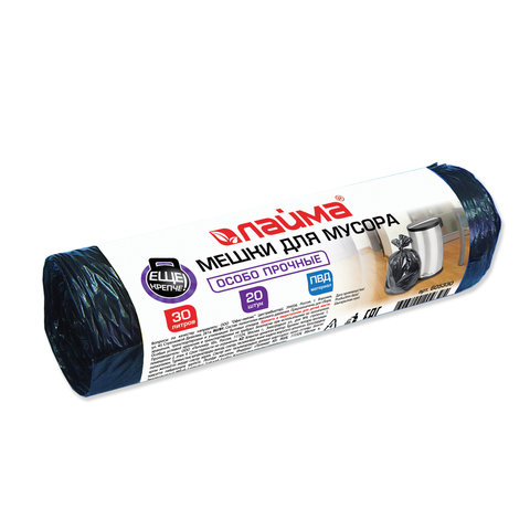 Мешки для мусора 30 л, черные в рулоне 20 шт., ПВД, 20 мкм, 50х60 см (±5%), особо прочные, ЛАЙМА