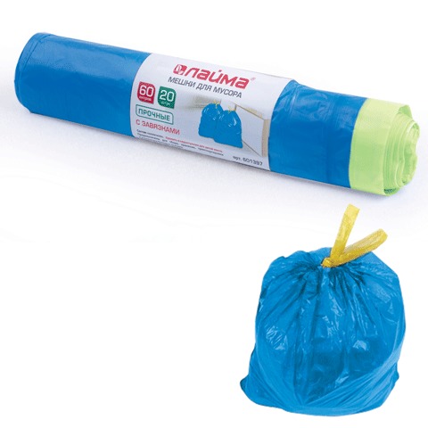 Мешки для мусора, 60 л, комплект 20 шт., рулон, ПНД, прочные, с завязками, 55х62 см (±5%), 12 мкм, синие, ЛАЙМА, 601397